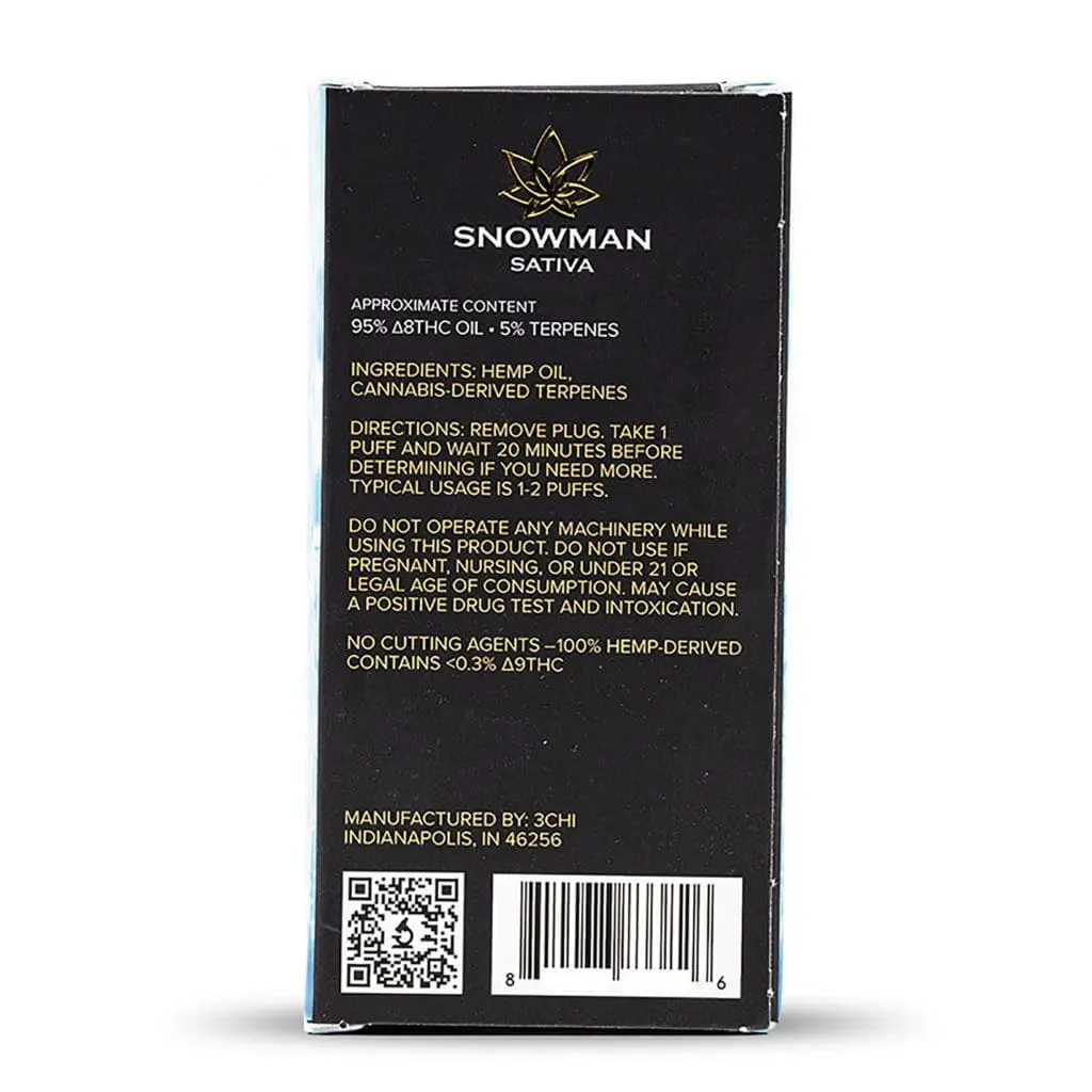 The 3Chi Delta 8 THC Disposable Vape Pen – Snowman has an unbeatable uplifting feel and contains 95% Delta 8 THC (Δ8THC) oil. Each 1 ml disposable vape pen contains a tasty blend of Delta 8 THC and Cannabis Derived Terpenes (CDT) that give this disposable vape pen a sweet vanilla flavor. There are no cutting agents, such as VG, PG, PEG, Vitamin E, MCT, or anything else, used in this premium product. This breathe-activated rechargeable vape pen does not require a separate battery.