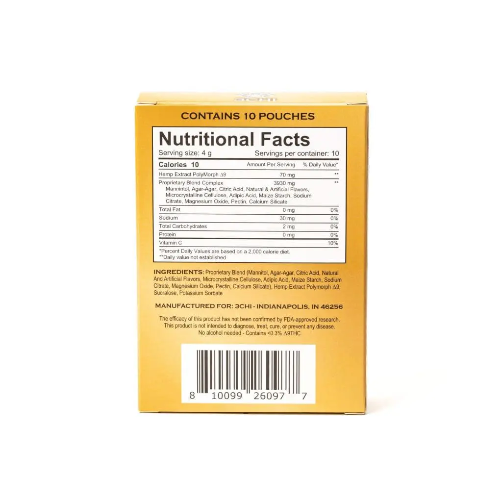 Add entire contents of one pouch to water, or any other drink.  No alcohol needed.  Hemp-derived Delta 9 Drink Enhancers can take as little as 5 minutes to kick in, which is faster than other traditional Delta 9 products, like gummies or baked goods. But everyone will experience the 3Chi Delta 9 THC Drink Enhancers differently, so it is recommended to wait at least 90 minutes after consumption before determining whether you need more.  “Start low and go slow.”