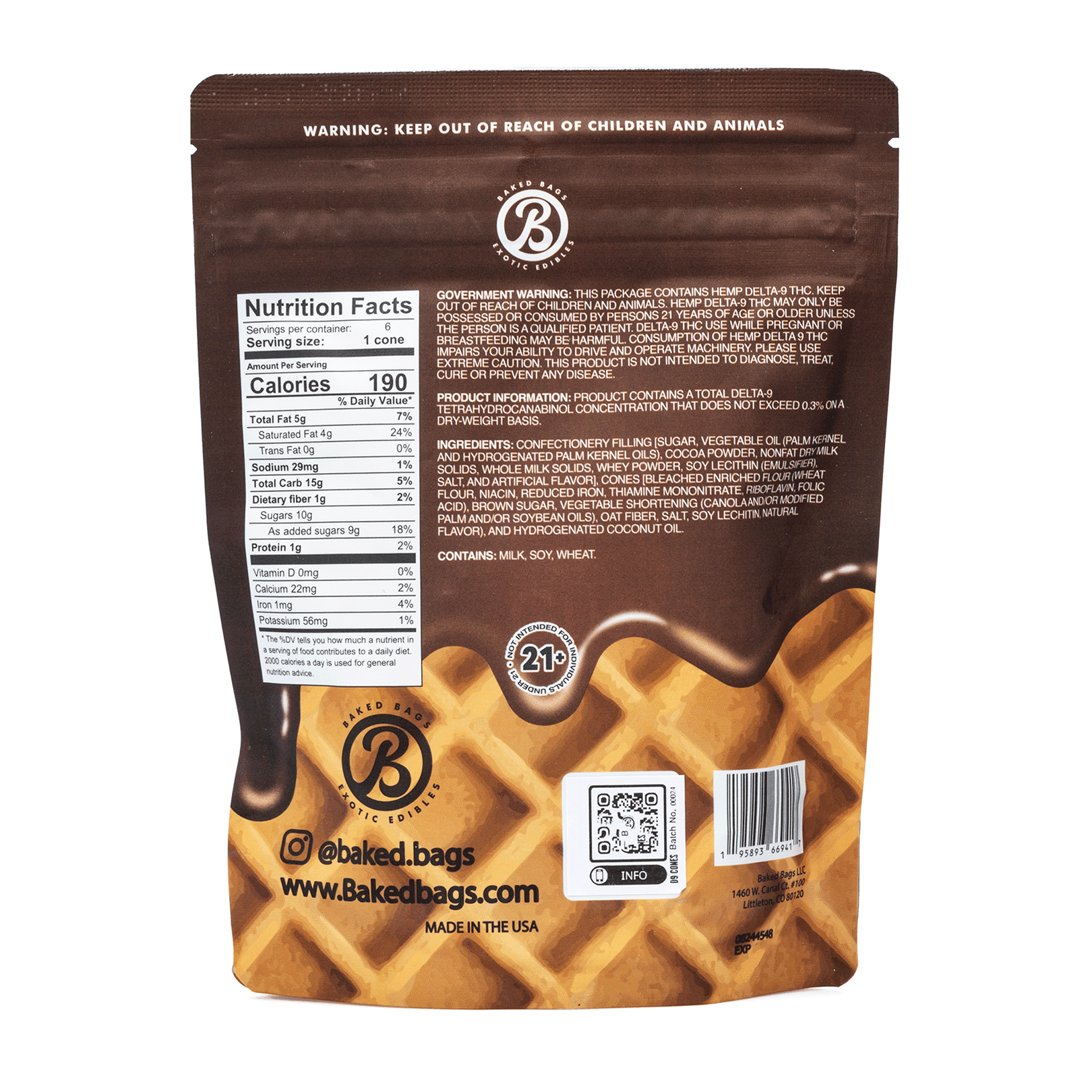 A rich oasis of relaxation awaits in every bite of Baked Bags Delta 9 THC Coned – Milk Chocolate. This decadent and creamy Delta 9 delight coats taste buds with milk chocolate goodness while being wrapped in a tasty ice cream cone. Only 190 calories and 11 grams of sugar make each Coned bite the best treat to satisfy a chocolate craving.