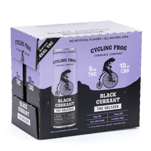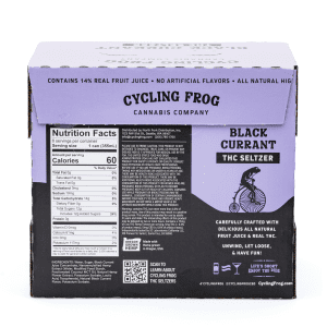 The Cycling Frog THC + CBD Seltzer 6 Pack – Black Currant is a hard seltzer alternative that will help you say goodbye to hangovers, bloat and unwanted calories. This seltzer is tantalizingly sweet and tart and designed to help you unwind, let loose and have fun. Each can contains 5 mg Delta 9 THC and 10 mg of CBD. Each package contains 6 cans, for a total of 30 mg of Delta 9 THC plus 60 mg CBD. Delta 9 and CBD work together using the “entourage effect” to potentiate each other which ultimately enhances your experience. All Cycling Frog seltzers are made with all natural fruit juice and contain no artificial flavors or coloring. They are crafted in small batches from 100% USA grown hemp and are vegan, non-GMO and gluten-free.