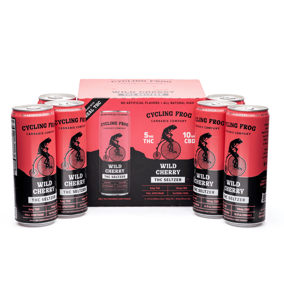 The Cycling Frog THC + CBD Seltzer 6 Pack – Wild Cherry is a hard seltzer alternative that will help you say goodbye to hangovers, bloat and unwanted calories. This seltzer has the perfect balance between tartness and tang and is designed to help you unwind, let loose and have fun. Each can contains 5 mg Delta 9 THC and 10 mg of CBD. Each package contains 6 cans, for a total of 30 mg of Delta 9 THC plus 60 mg CBD. Delta 9 and CBD work together using the “entourage effect” to potentiate each other which ultimately enhances your experience. All Cycling Frog seltzers are made with all natural fruit juice and contain no artificial flavors or coloring. They are crafted in small batches from 100% USA grown hemp and are vegan, non-GMO and gluten-free.