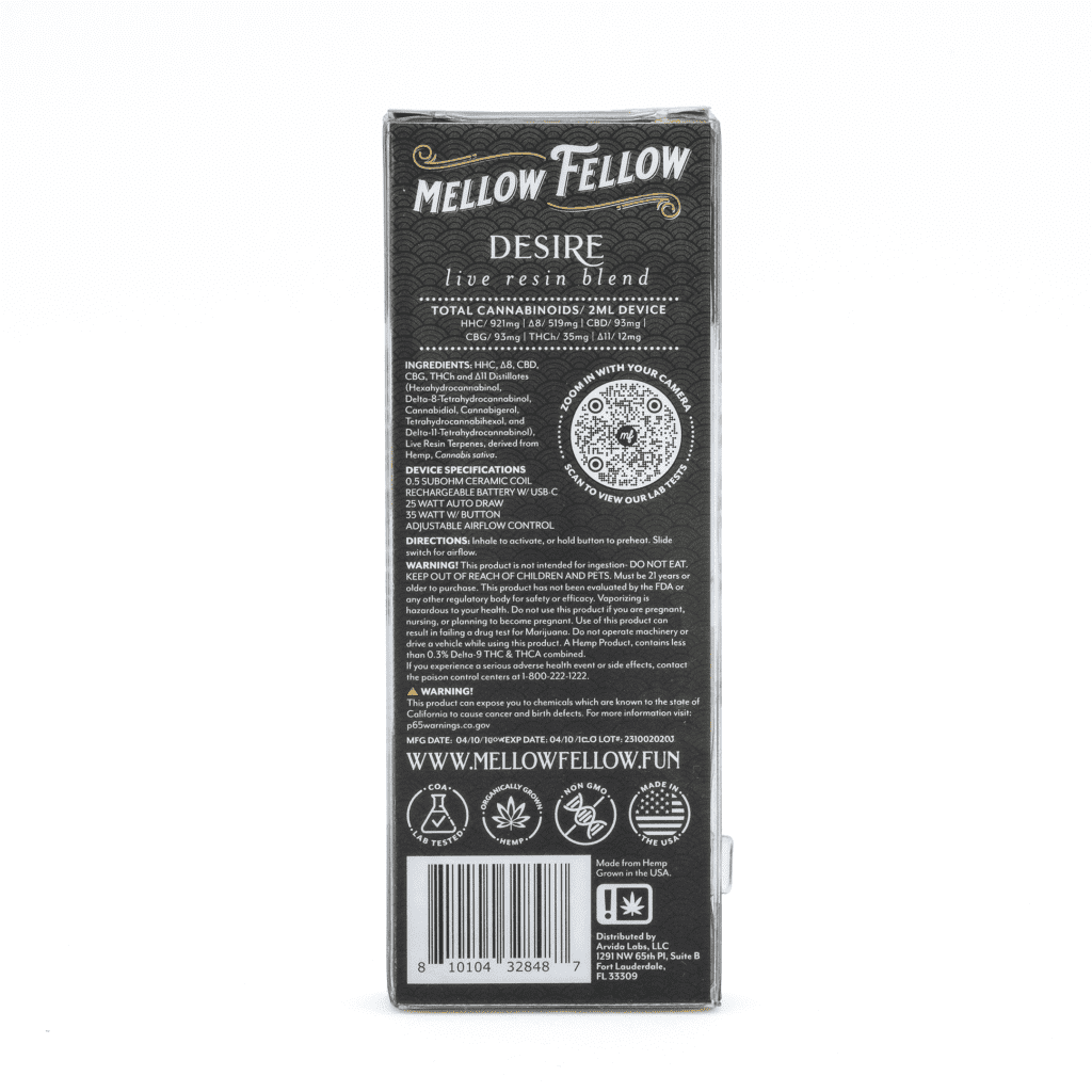 The Mellow Fellow Desire Blend Live Resin Disposable Vape – Cali Gas is luxury captured in a disposable vape ready for you. This vape uplifts the mind with sensual lemon and berry inhales and relieves body stress with diesel tasting exhales. Ignite your passion and your senses with Desire.