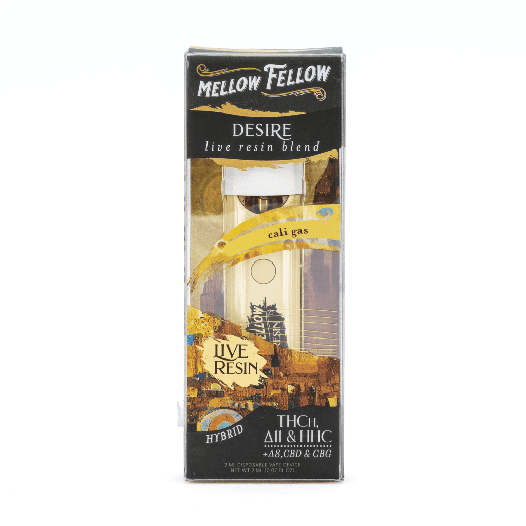 Cali Gas is a highly potent hybrid strain that is cross of P Star OG and Lemon Crush. It is known for making consumers giggly, aroused, and tingly. Mellow Fellow captured this flavor profile with the live resin extraction method and paired it with their Desire cannabinoid blend. The combination of THCH, Delta 11, Delta 8, HHC, CBG, and CBD affect the mind with a rush of exhilaration and leave the body relaxed for much longer than expected.